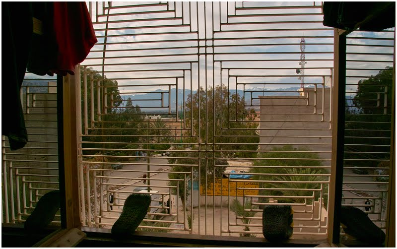 ... aby wieczorem, już od niechcenia, pstryknąć fotkę z hotelowego okna.Przed wyjazdem sprawdzam stan mojego jednośladu. Dwie urwane szprychy oraz starte klocki hamulcowe. Klocki znowu przemieniam z lewej na prawą i z tyłu na przód. Szprychy zapasowe posiadam dokładnie dwie, a to i tak tylko dzięki uprzejmości Janka albo Izy, którzy na moją prośbę zostawiają mi je po drodze przy znaku Agadir 192. Dziękuję.